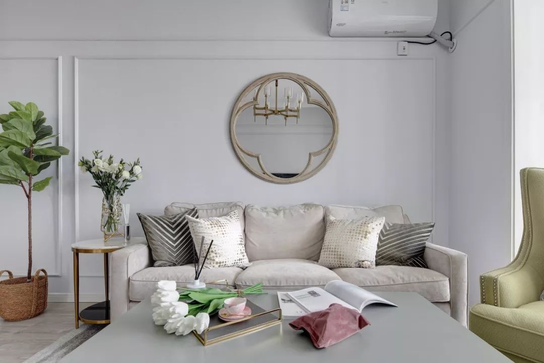 客厅内摆放了许多绿植鲜花,再加上沙发背景墙上的梅花造型装饰镜,让整体充满了艺术气息。