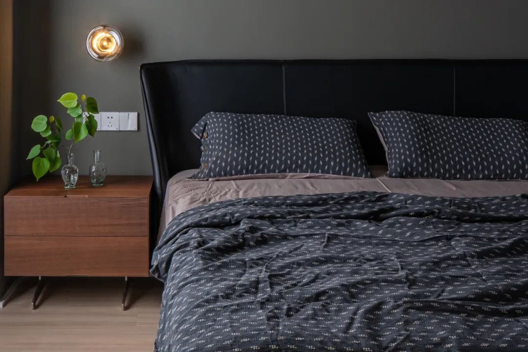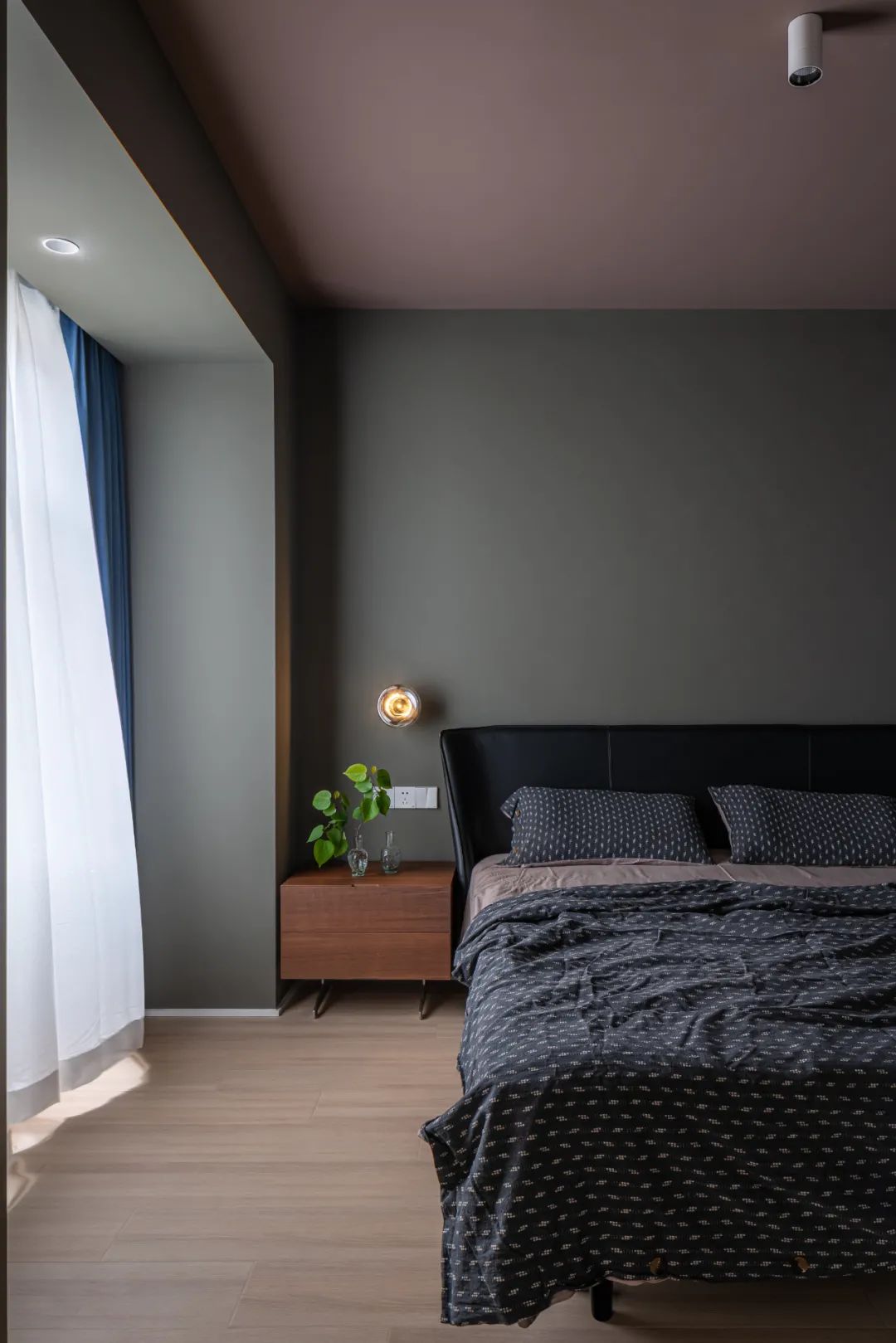 柔软织物带来的情绪递进,皮革和实木体现生活的质感,深色的墙漆,金属构件点缀其间,搭配原木色的地板,营造沉稳大气的睡眠环境。