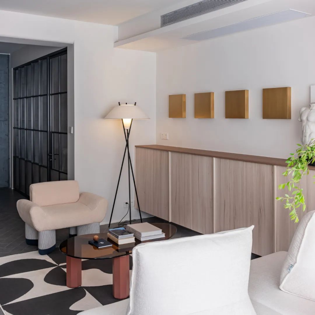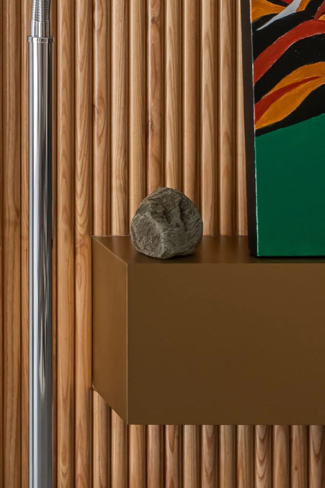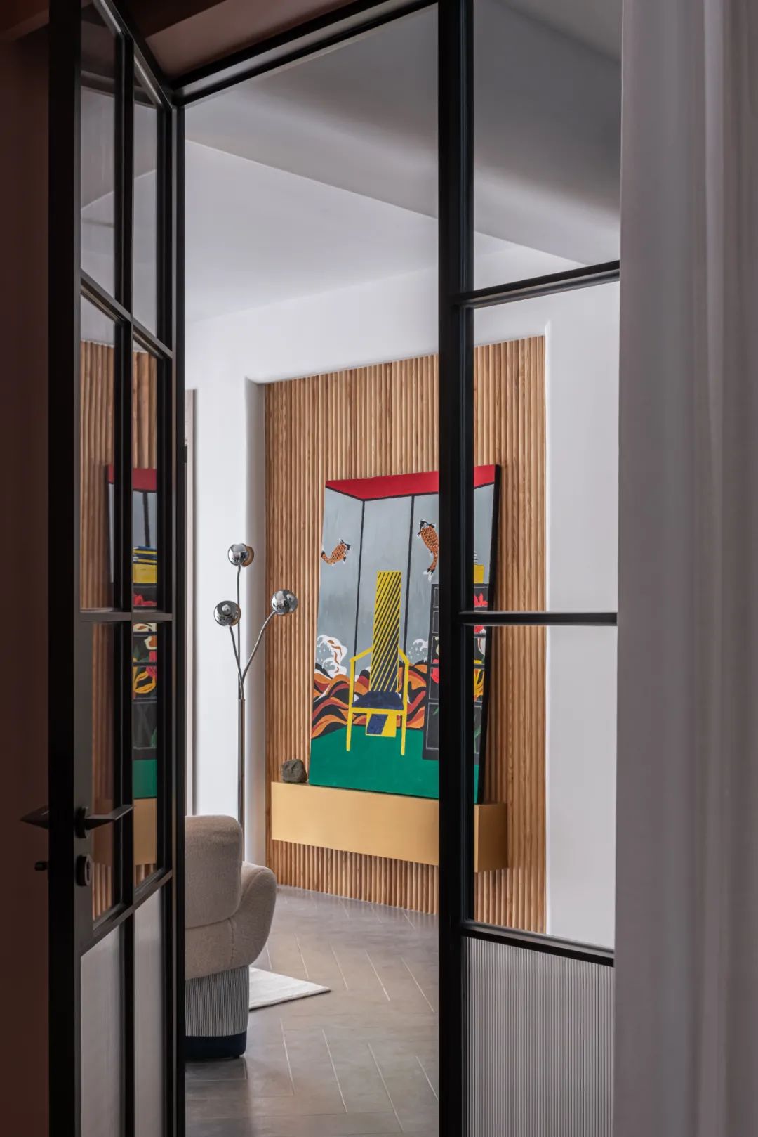 墙面整洁有序地分布着的几何体块,呼应玄关左侧的金属功能盒和电视墙的长条金属电视柜,材质冲突达到小小的构件乐趣。