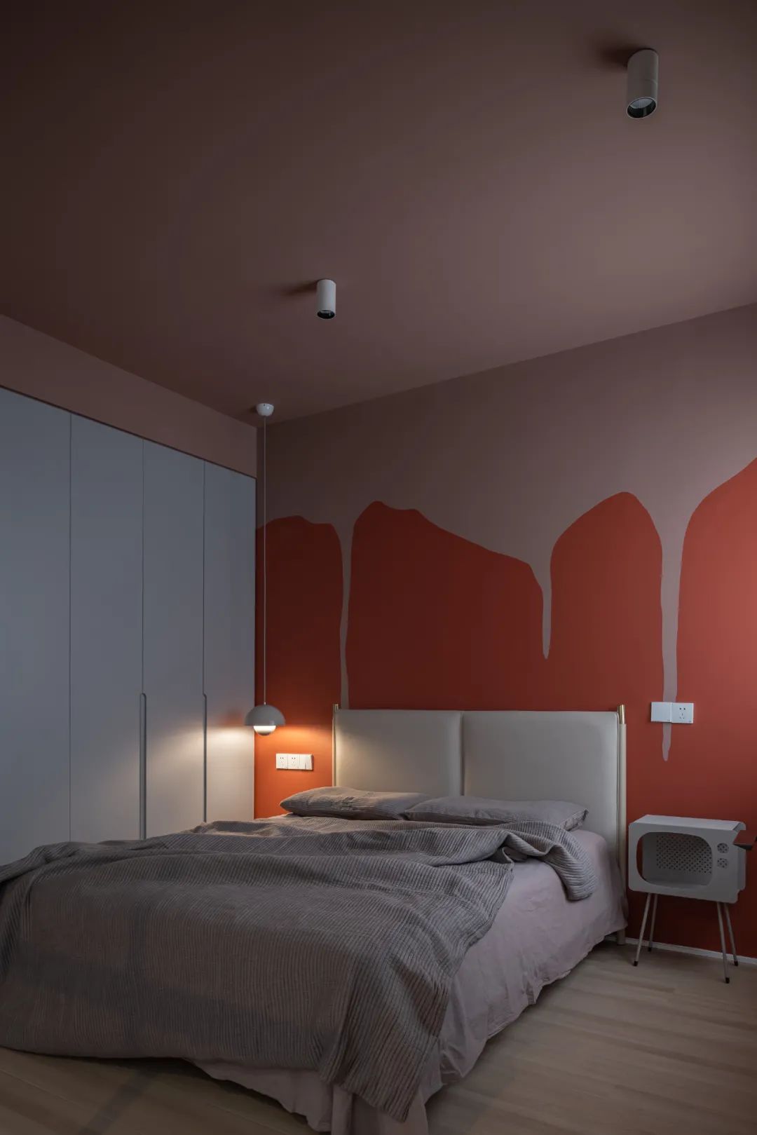 在有限的造价前提下,我们运用了两种不同色阶的乳胶漆来进行创意的开展,仿山或者峡谷的写意图案让空间趣味感十足。
