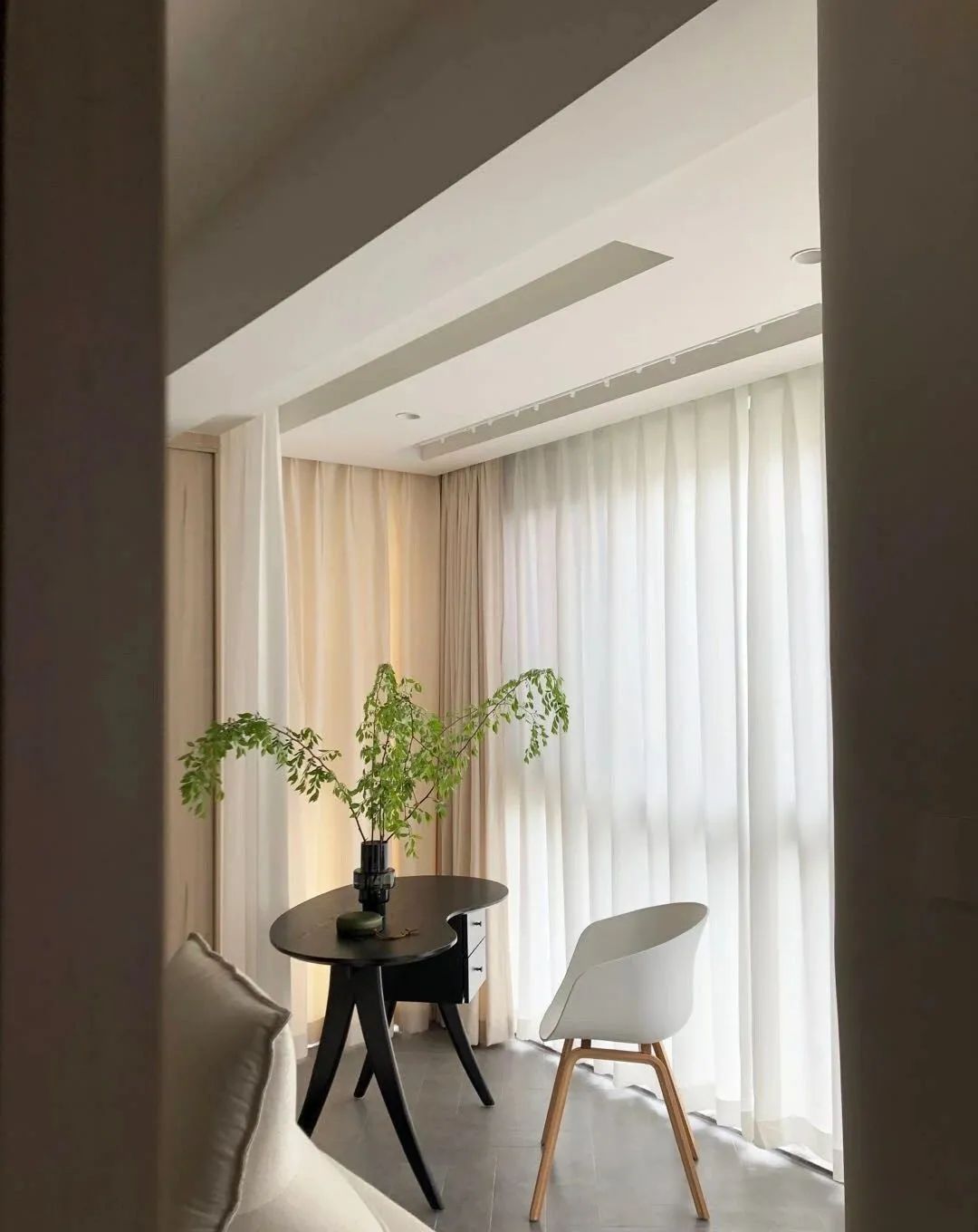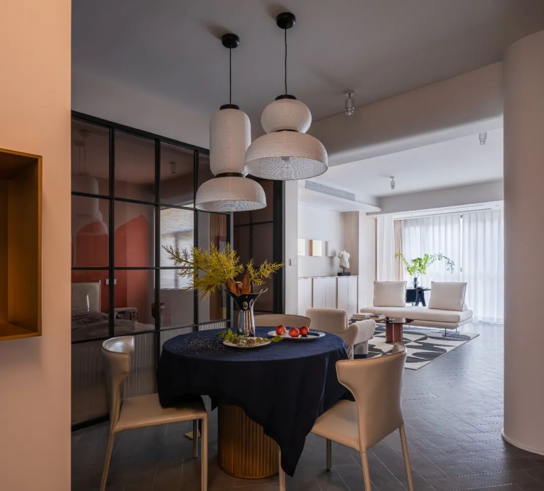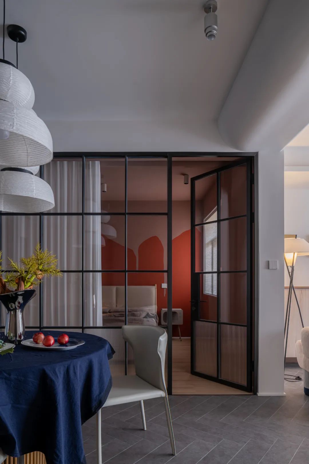餐厅和儿童房之间采用金属框玻璃门+窗帘,既保证隐私性,又让两个空间紧密联系了起来,互相扩充空间的视觉尺度,充当彼此的背景板。