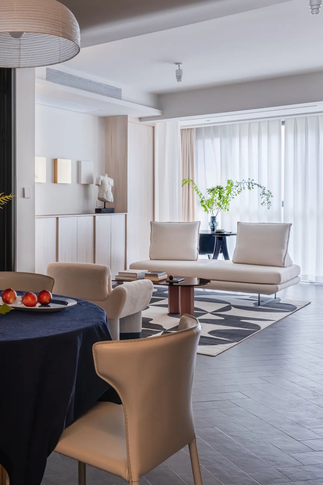 蓝色的餐桌布,米白色的皮革餐椅,一目了然的色彩和精准把控的细节,兼具家具艺术感与实用性,是空间审美个人化的重要组成部分。