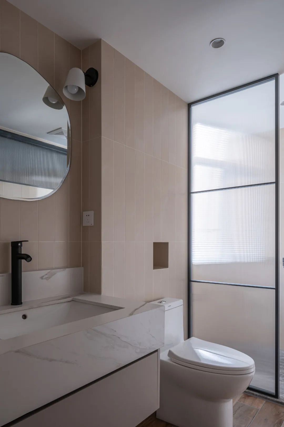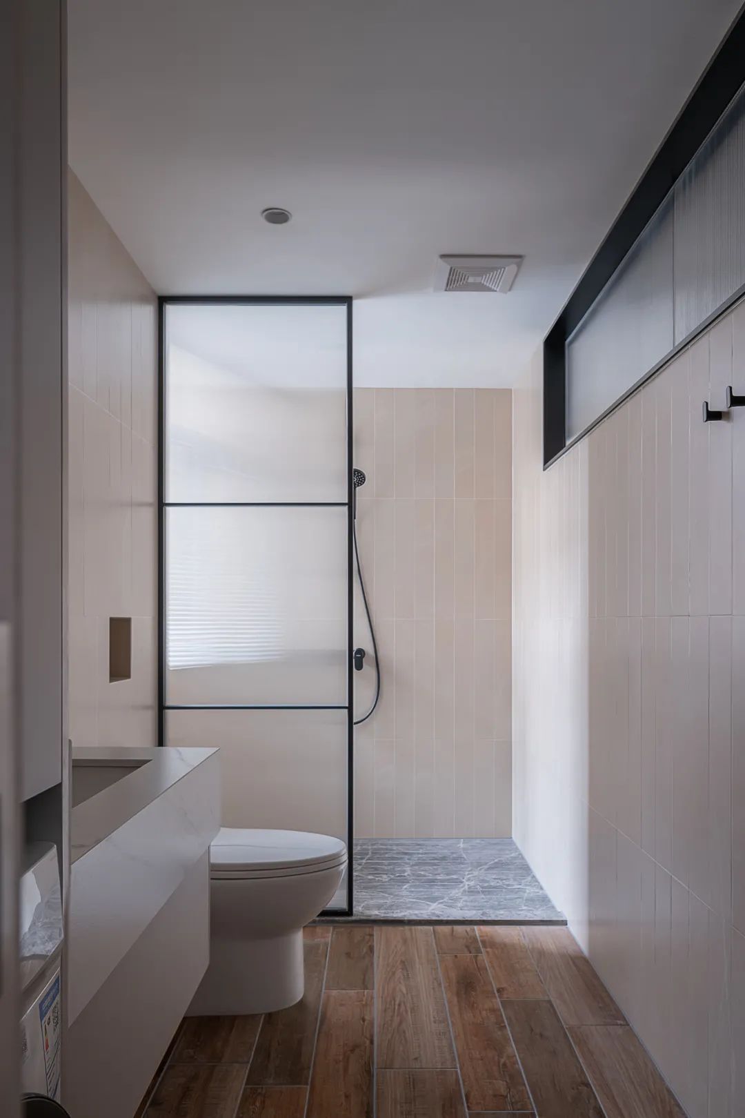 轻松兼规整感是卫生间给我们的第一视觉印象,墙砖选用了一款米色的条形砖进行铺贴,干区地面采用了不同规格尺度的木纹砖。