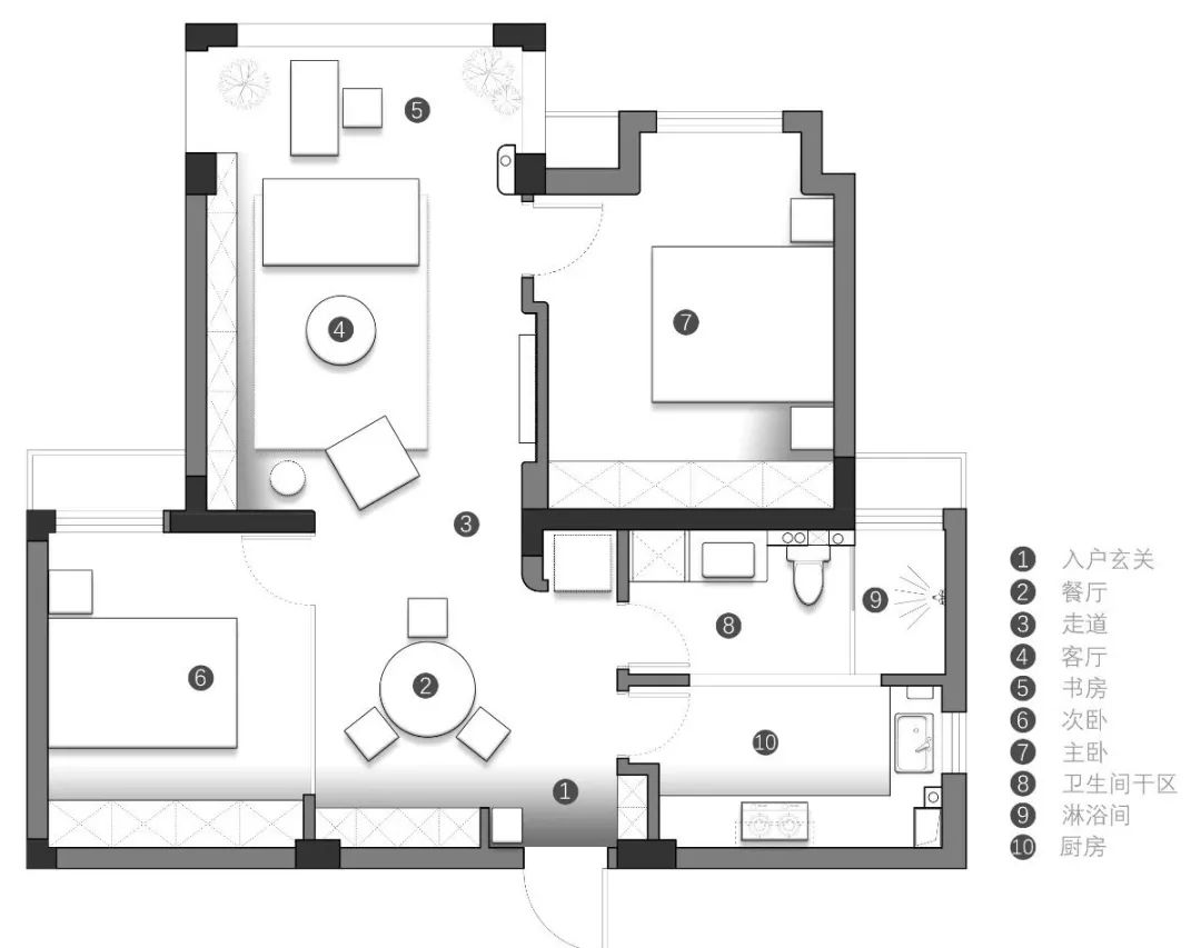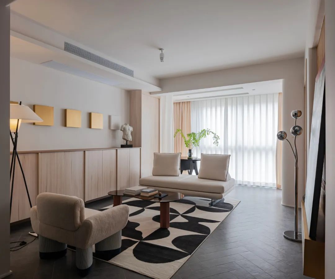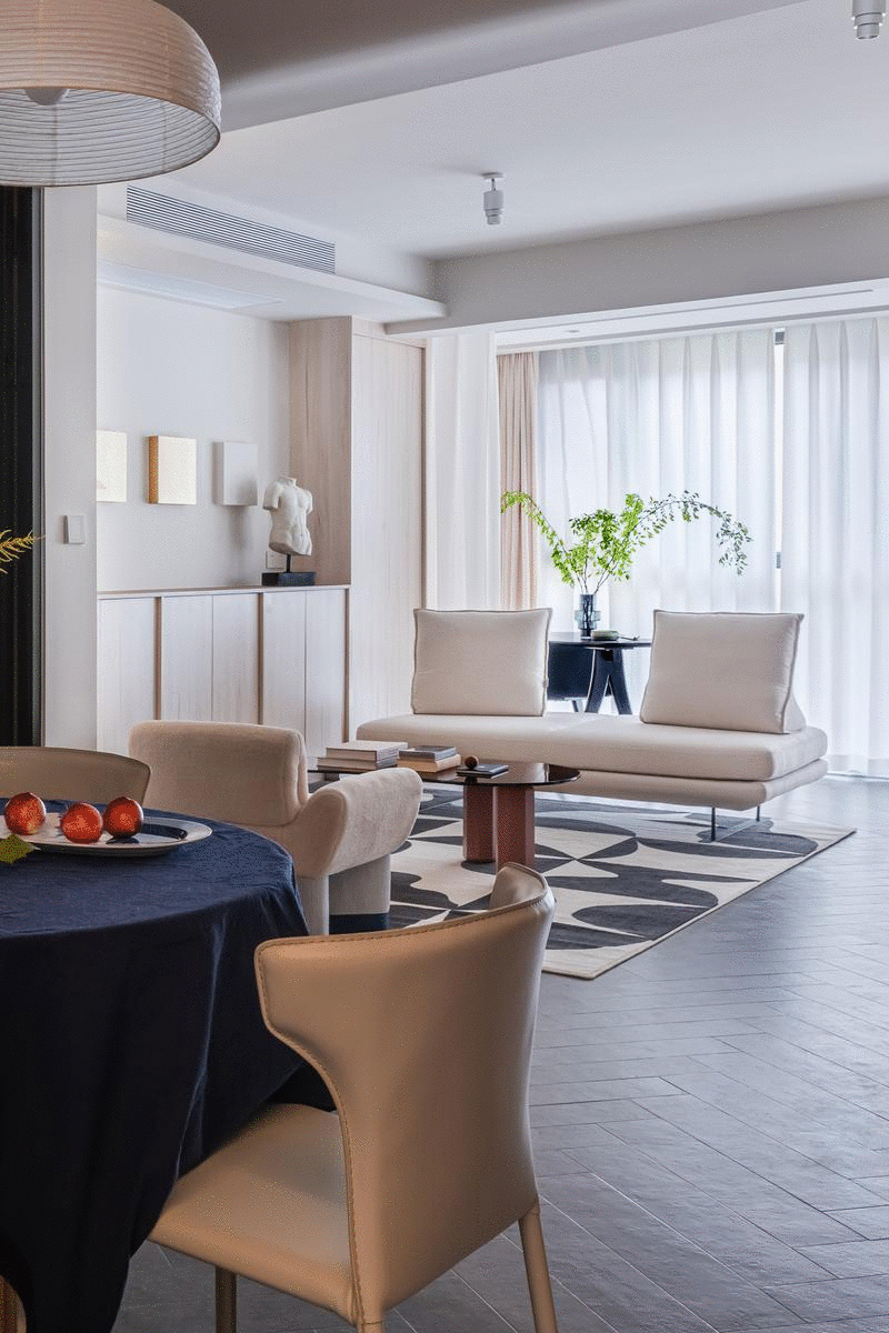 区别于传统客厅沙发面对电视墙的布局手法,围合式的客厅布局更符合当下青年群体在家聚会和情感交流的需求。