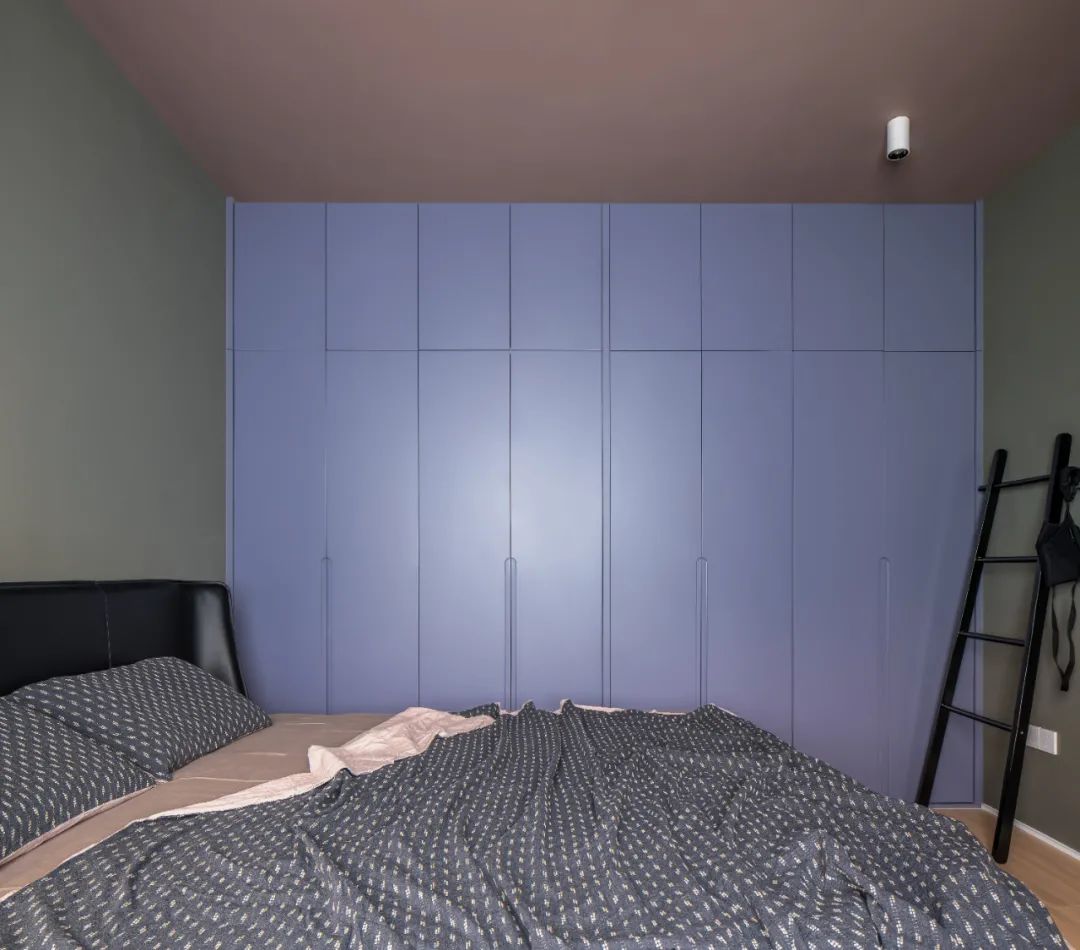 主墙面设置了顶天立地的大衣柜,最大程度满足主卧男女主人的收纳之需,突出的立板和内凹的拉手设计亦深刻了细节。