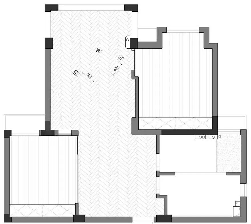 我们选用了两种宽窄度的砖进行拼接来增加地面的细节感。全房踢脚线亦是采用了20mm的白色极窄实木脚线。
