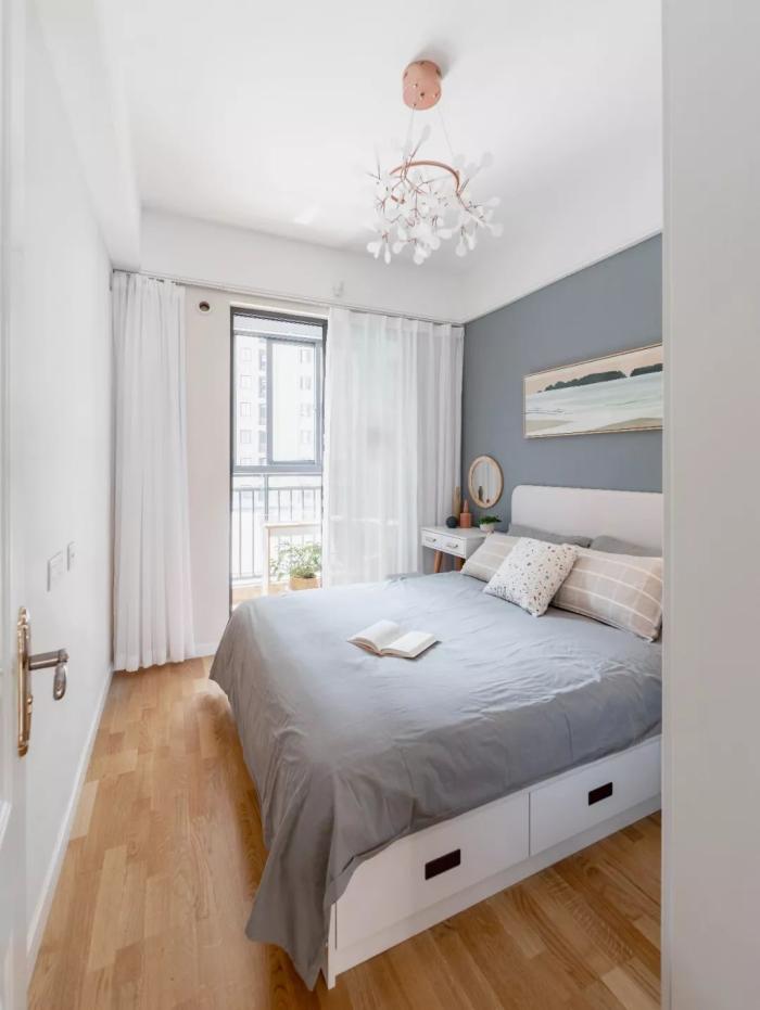 次卧,蓝灰色的床头背景墙搭配灰色床单,整体设计简单大气。抽屉式床体收纳和整面墙的衣柜设计,让小空间既实用又简洁。