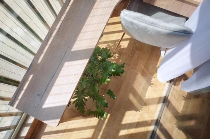 右侧部分,靠窗装了一个转角书桌,冬日里在阳光的照射下,享受着自然的日光,为屋主提供了一个舒适惬意的工作台。