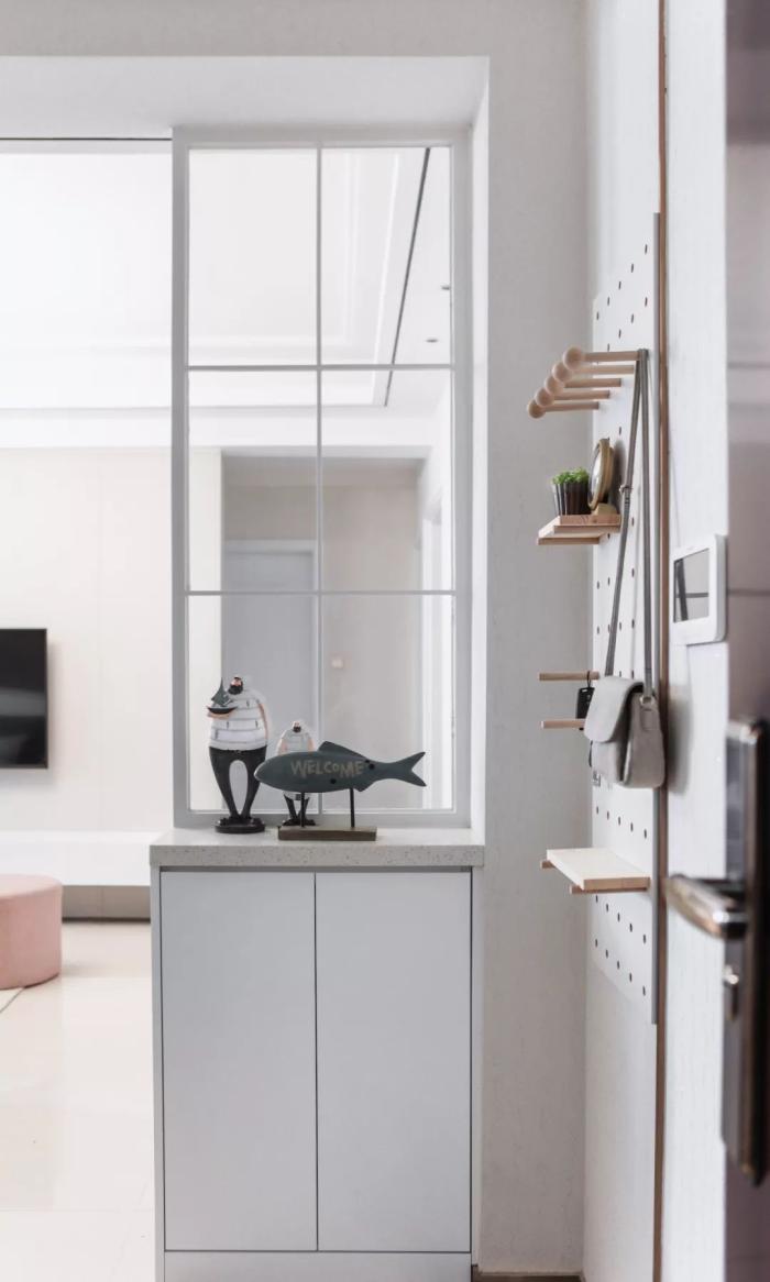 进门对着长长的走廊,一眼就能望到底。设计师利用矮柜+玻璃隔断的设计,对其视觉性的阻隔,保护了隐私。右侧墙面设计了洞洞板挂钩,钥匙、包包、帽子等轻松收纳。