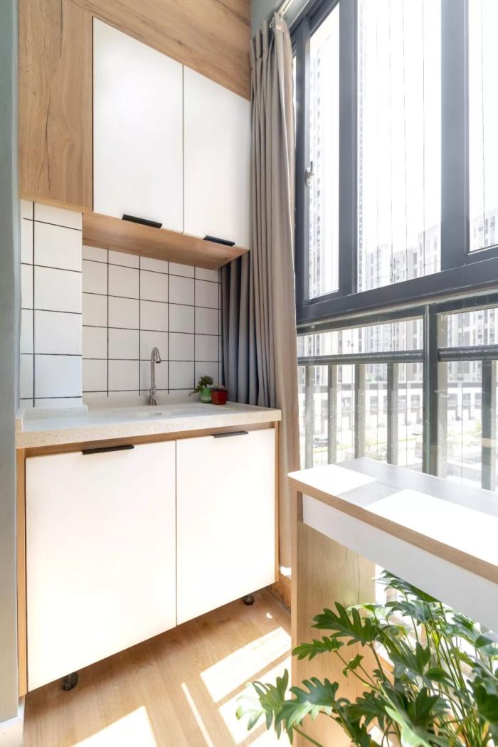 阳台空间设计成两个功能区域,左侧设计洗手盆+吊柜,为生活增加便利。木色柜体搭配白色柜门,简约又大气。加上绿植的点缀,让整个空间充满了轻松自然的氛围感。
