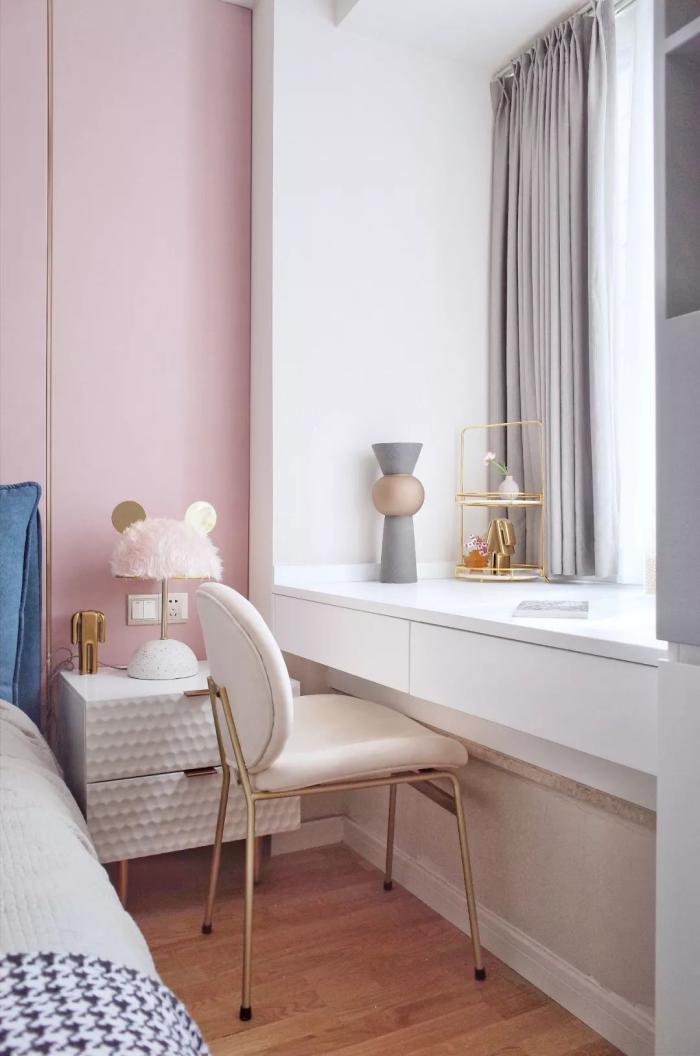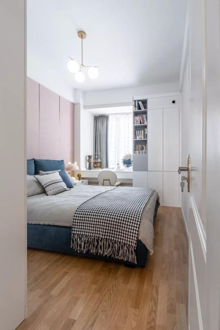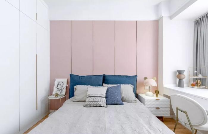 卧室以粉色的硬包作为床头背景墙,以舒适的软装布置,营造出温馨雅致的氛围感。