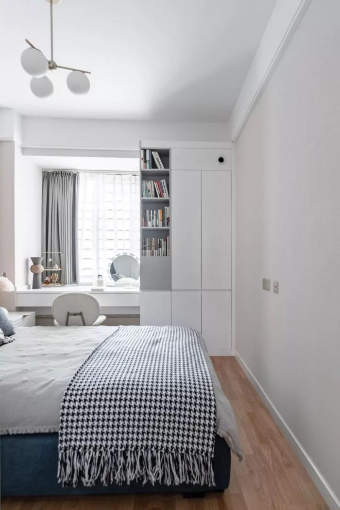 设计师利用飘窗+收纳柜一体化设计,开放格书架设计,让空间看起来更有层次感。在梳妆台放上电脑,瞬间变成办公区域,一个空间多种用途。