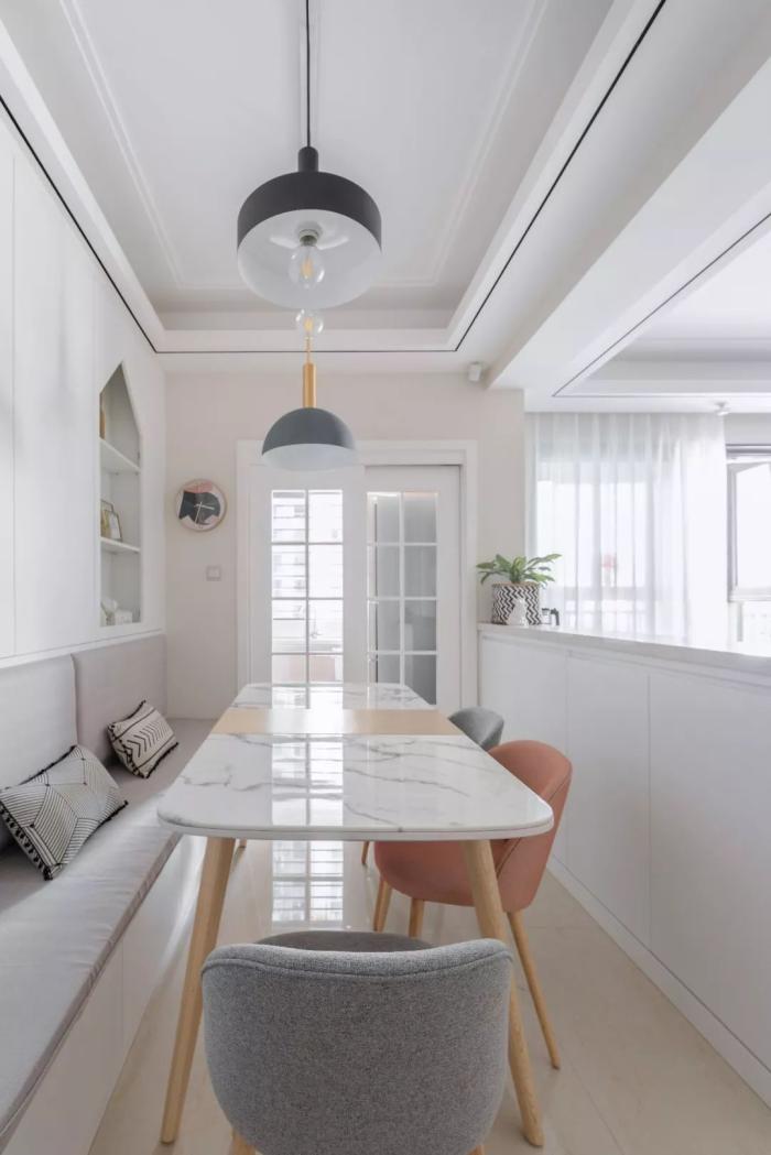 餐厅以卡座式的座椅,搭配白色大理石材质的餐桌台面,还有灰粉色搭配的餐椅与吊灯,让餐厅闲适轻松好惬意。