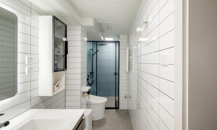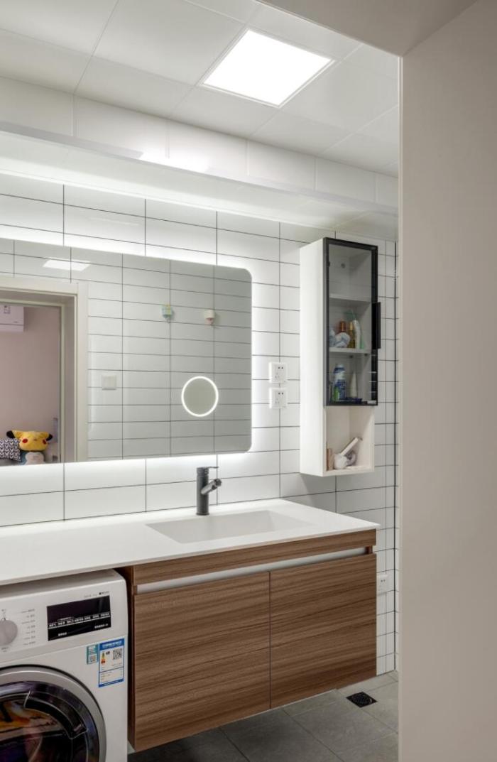 来到卫生间,台盆柜悬挂安装,不仅避开了与地面积水接触,还让洗衣机实现了内嵌。而舍弃笨重的镜柜,并选择大尺寸的智能镜,也做到了轻盈、便捷。当然,侧面的壁柜也弥补了日常的收纳需求。