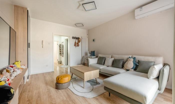 来到客厅,整体以低饱和度的色彩为基调,再通过温润的原木元素点缀,既彰显出了清新、治愈,又做到了干净、轻盈。
