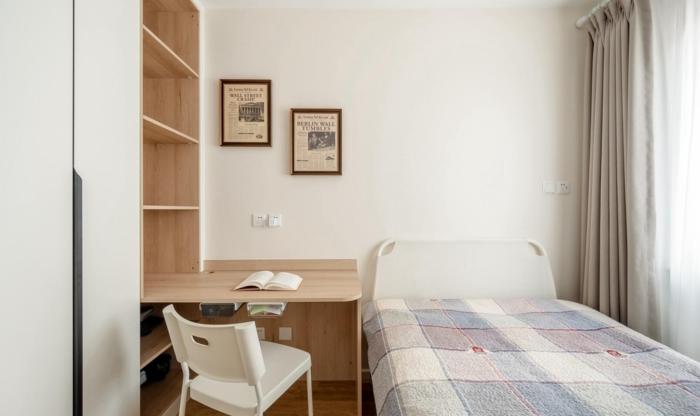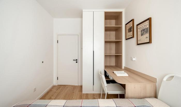 次卧目前是以客房来定位的,不过一体化的衣柜、书桌设计,却也兼具了书房的功能,并保证了空间的整体性。而大量留白式的处理手法,也为空间赋予了更多种可能,以方便后期改造成儿童房。