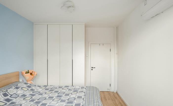 来到主卧,床头墙面单独刷上雾蓝色的乳胶漆,可以让空间氛围更加安宁、沉稳,并且与白墙搭配后,还强化了空间层次。虽说布局很简单,但U形结构的衣柜设计,也是非常显细节的。打开柜体后,内部的空间非常大。这点大家可以通过平面图来查看。