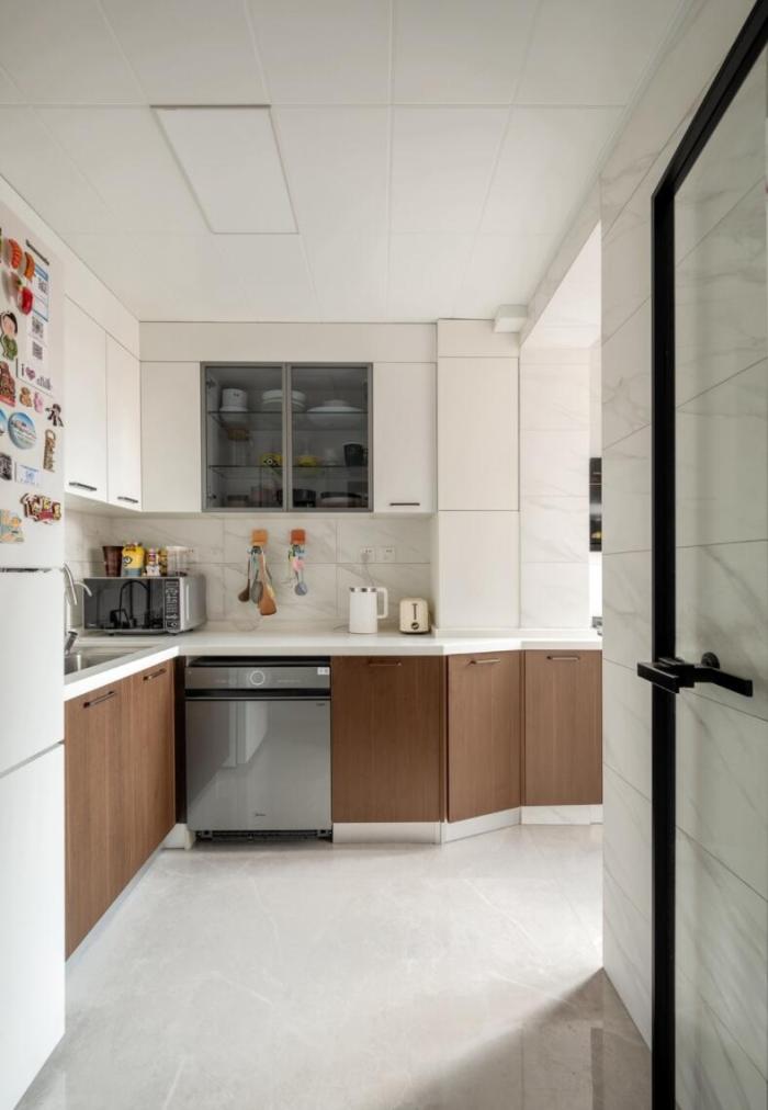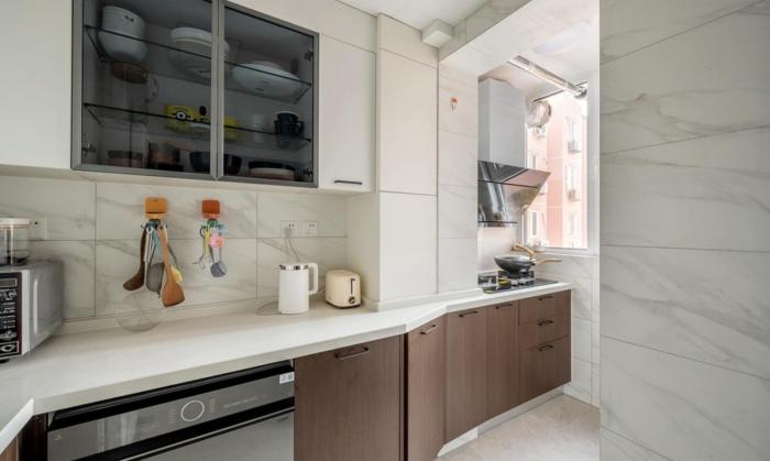 吊柜设计十分显细节,首先是以围合式的结构与橱柜相连,可以让空间得到充分利用。其次是中间位置选择玻璃柜门安装,既提高了空间颜值,也彰显出了生活的品质感。
