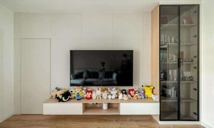 电视墙底部采用石膏抽缝的造型来处理,既有效拉伸了空间层次,也让旁边的卫生间门实现了隐形,从而避开了视觉上的尴尬。而一体化的电视柜、展示柜设计,则在满足日常收纳的同时,带来了很不错的装饰效果。