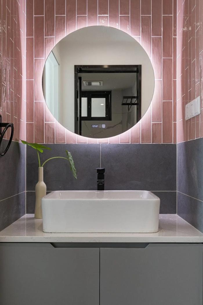 外置洗手台,卫浴空间不拥挤。粉红色+灰色,巧妙搭配,色调和谐。