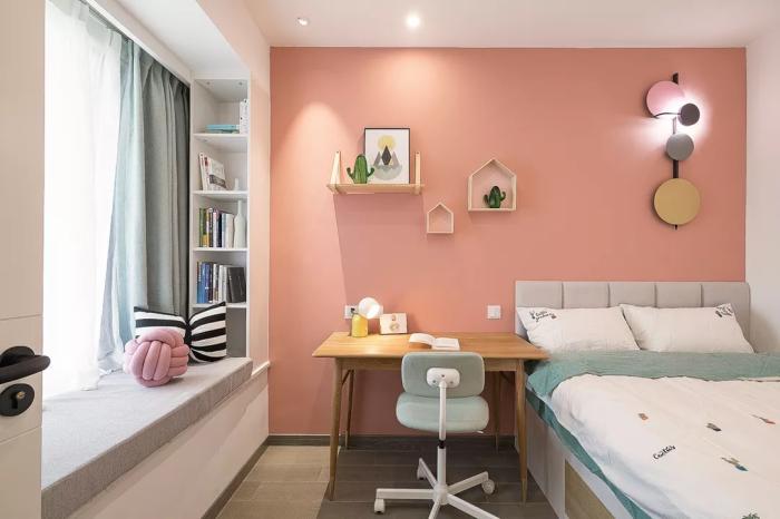儿童房以粉色为主色调,清新时尚。单人床+原木书桌+休闲飘窗,功能齐全,颜值在线!