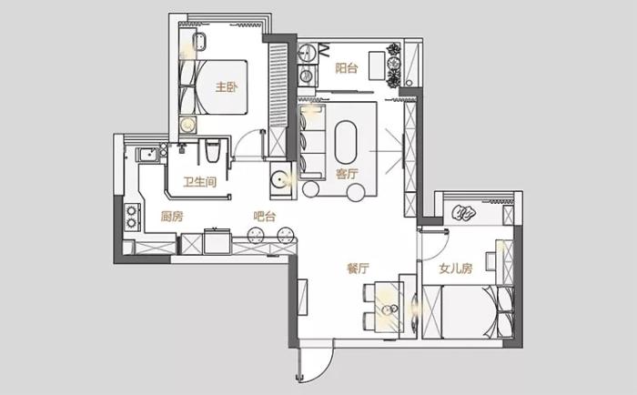 主卧温和静谧,空间虽小却倍感温馨。灰白色基调点缀小面积粉色,让舒适感更强。
