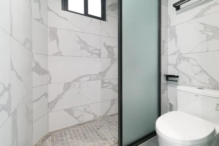 卫生间设计干湿分离,淋浴区和马桶区采用玻璃隔断,方便清洁打扫。