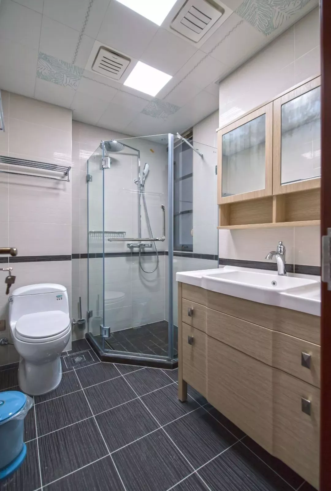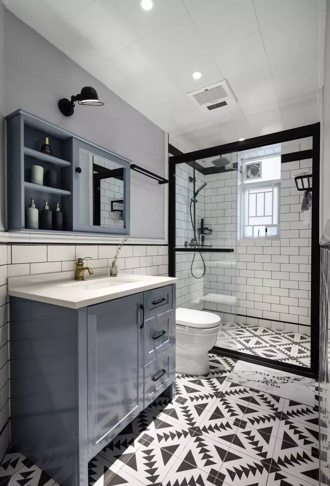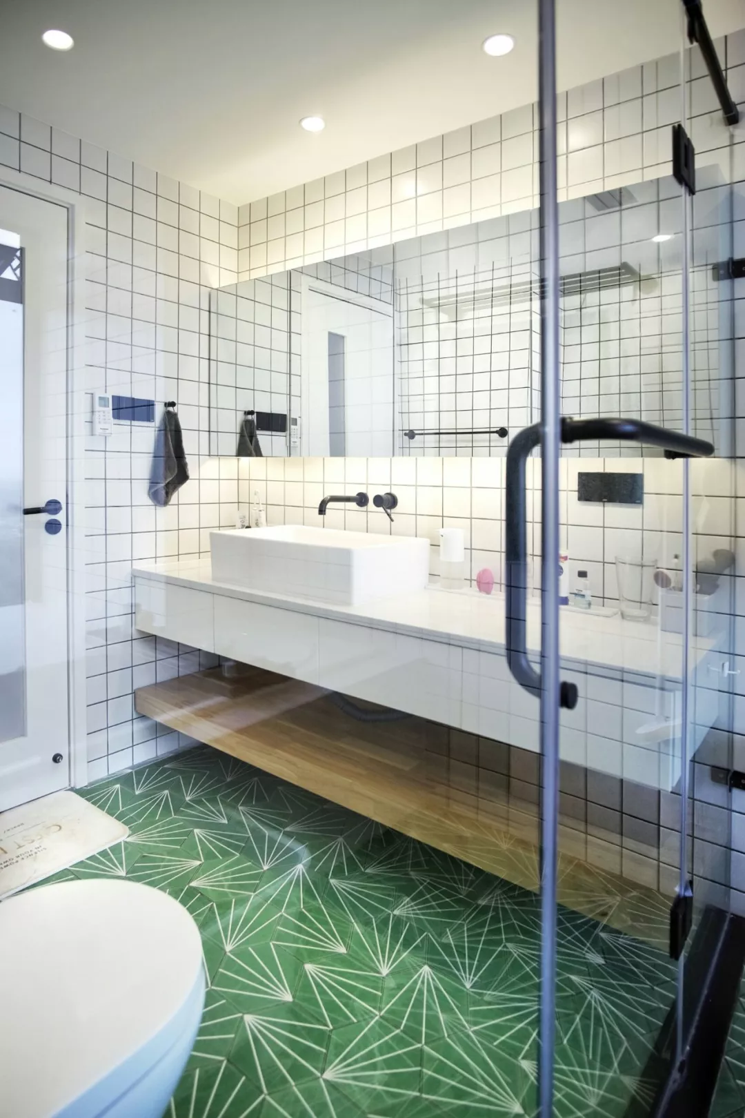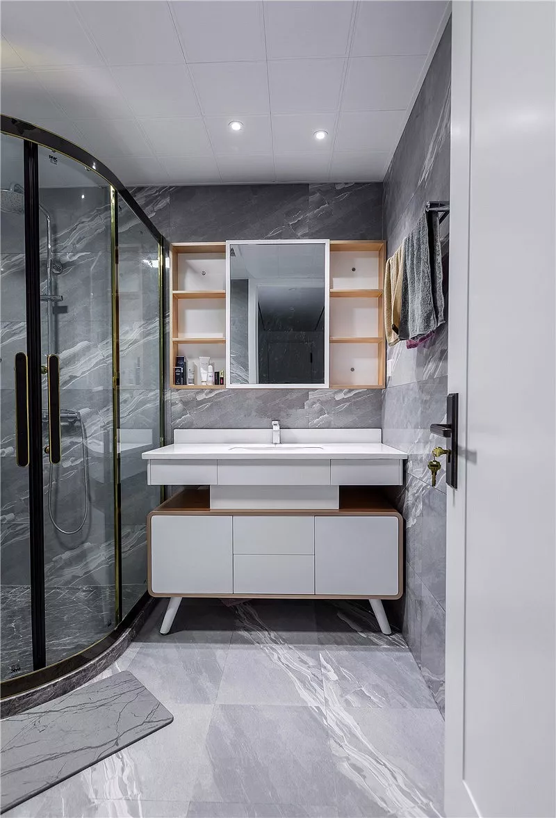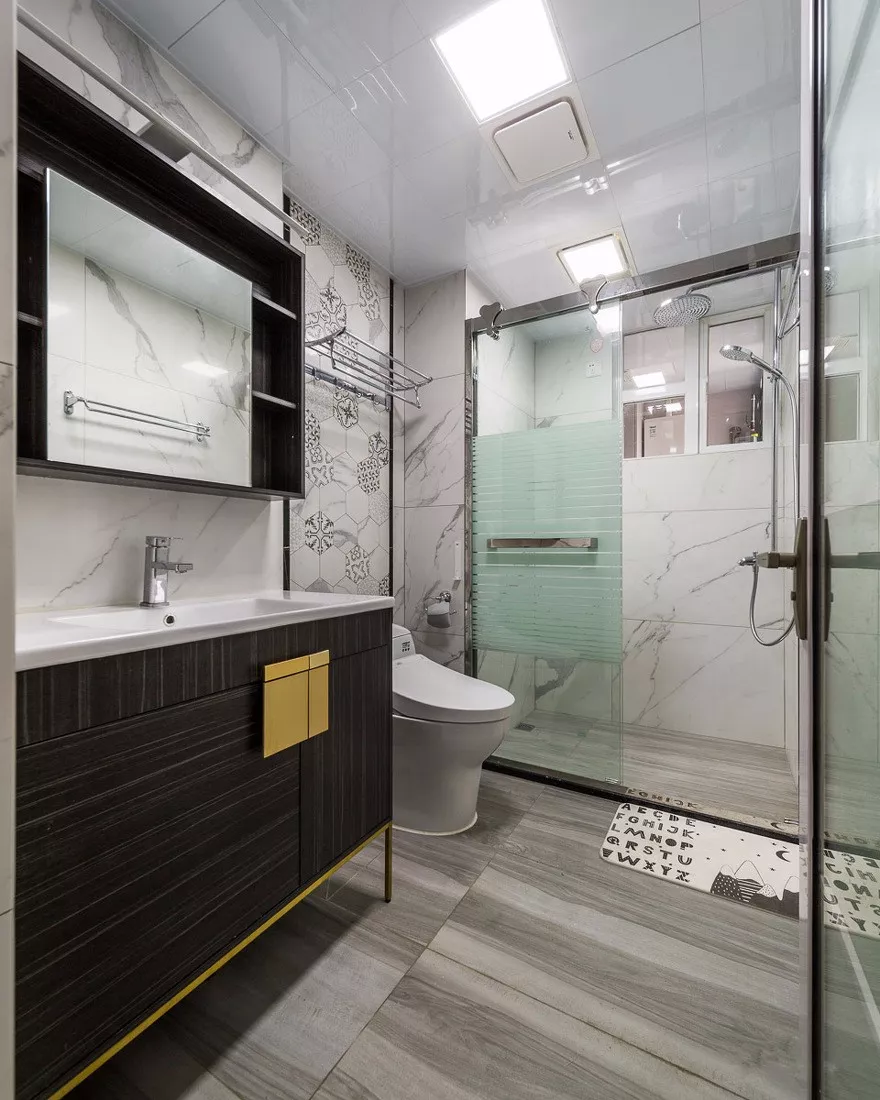 像是卫生间比较正正方方的,就适合做成三角形的布局,把洗手台和马桶放在淋浴房的两侧,淋浴房做在转角的位置,布局更为紧凑和实用。