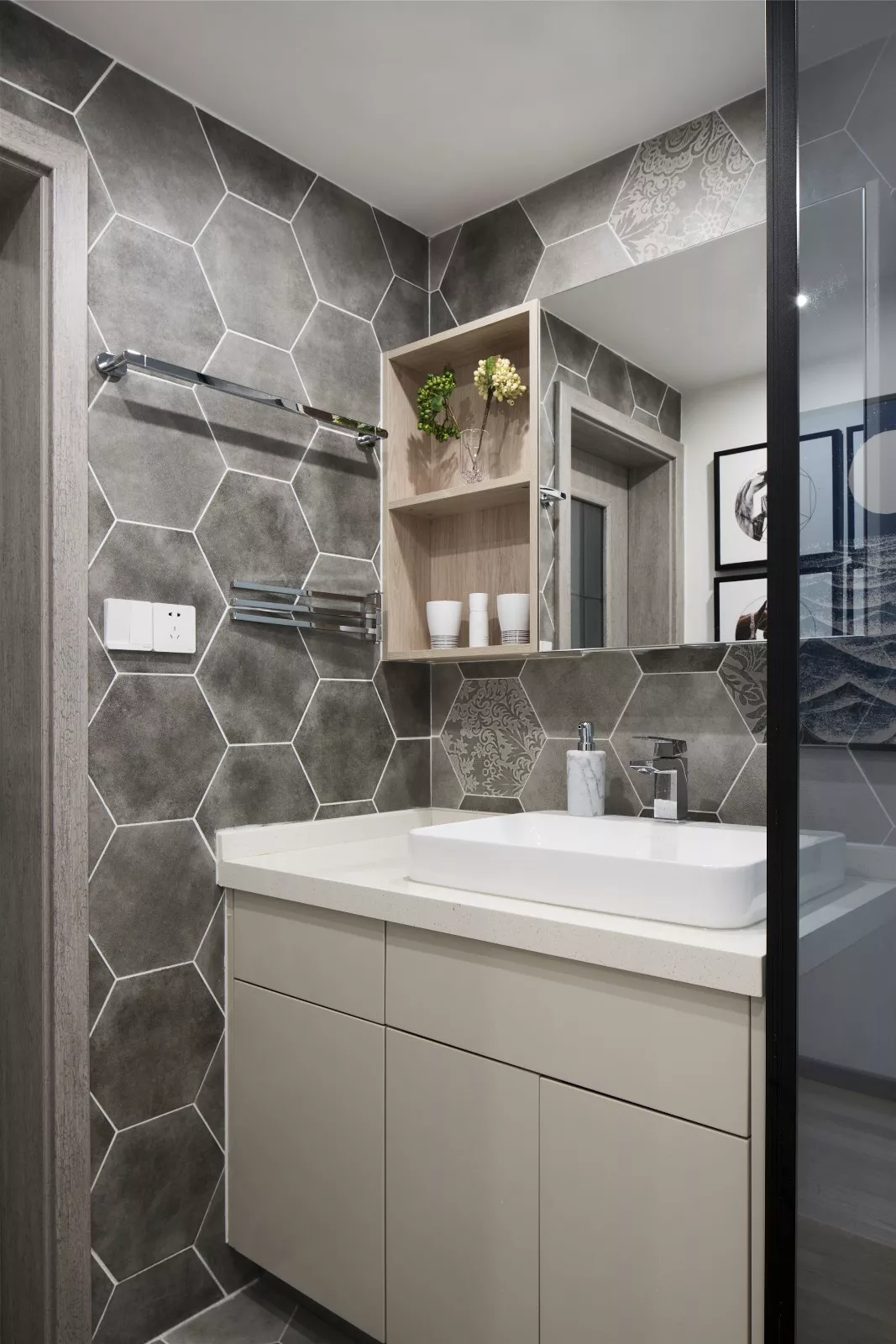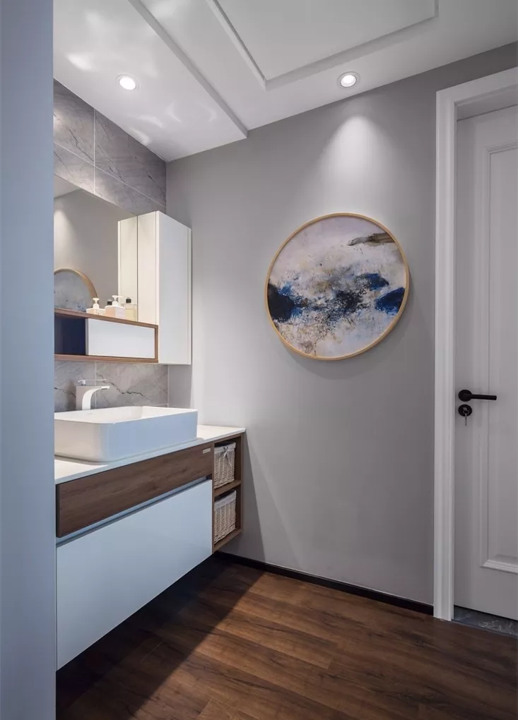 对于一些家里只有一个卫生间或卫生间面积比较小的,还会选择把洗手台给放在卫生间的门外,这样可以把干区和湿区给完全分开。