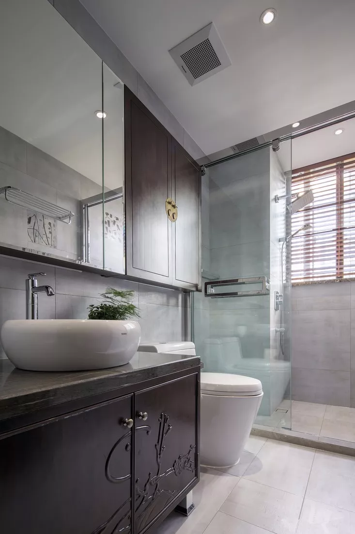 当然也还有其他的布局方案,比如洗手台和马桶对着摆放,侧方再做淋浴区的布局方案,洗手台的台面可以做得更大一些,能够摆放更多的东西。
