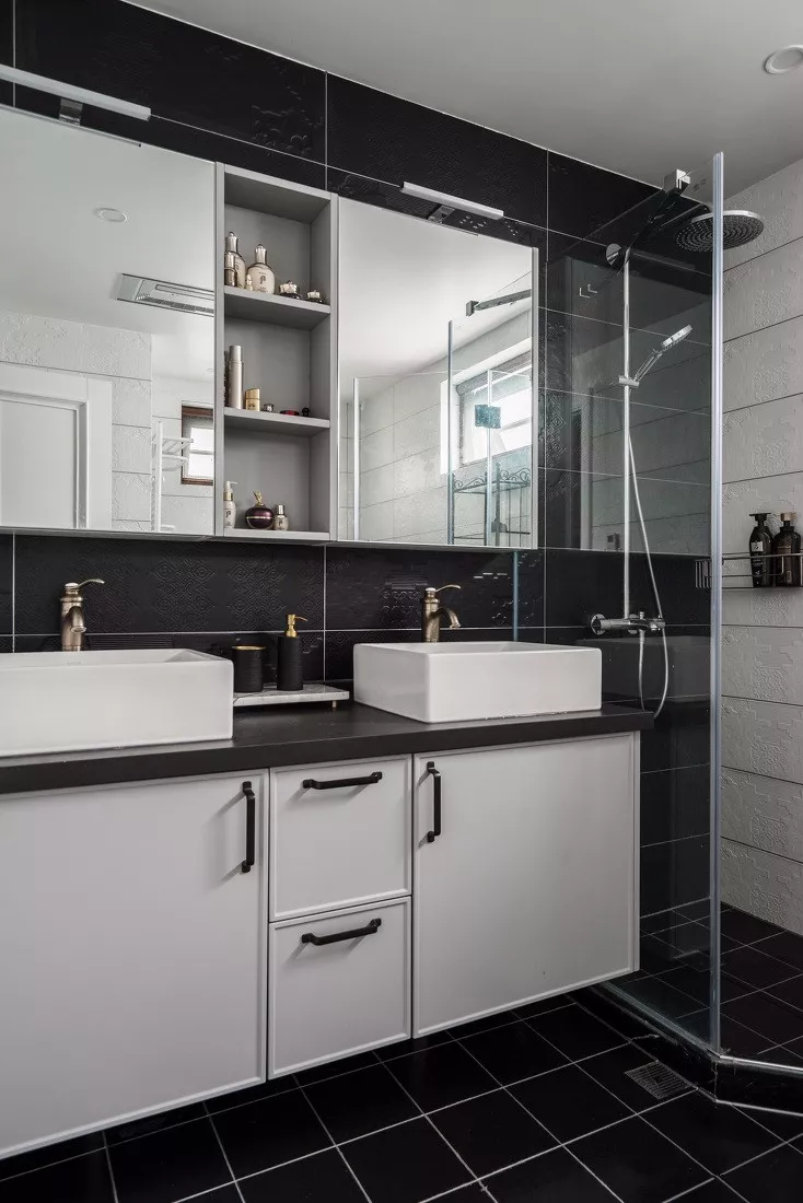 或者干脆就是做上双洗手台的设计,让你和爱人可以一起洗脸刷牙,更进一步的避免争抢卫生间的问题,当然这也需要卫生间的面积足够大~