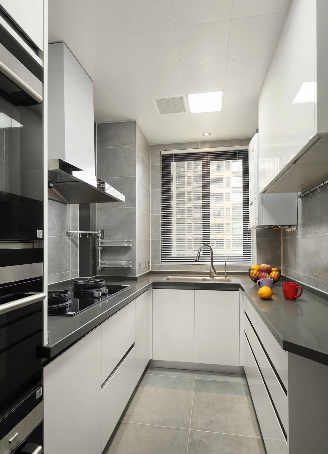 厨房呈U型布局,灰色台面耐看也易于打理,操作起来也更加方便。白色橱柜结合电柜,丰富了厨房的收纳空间,文艺又好看。