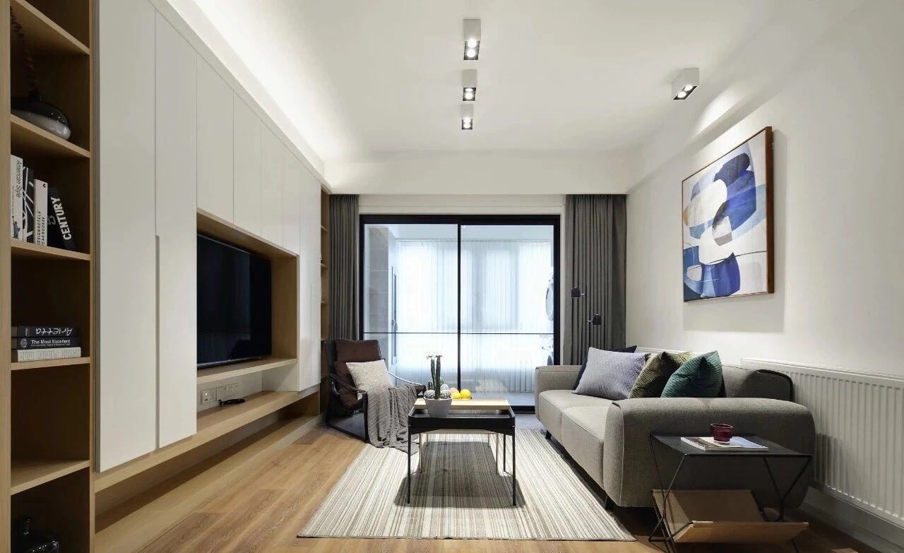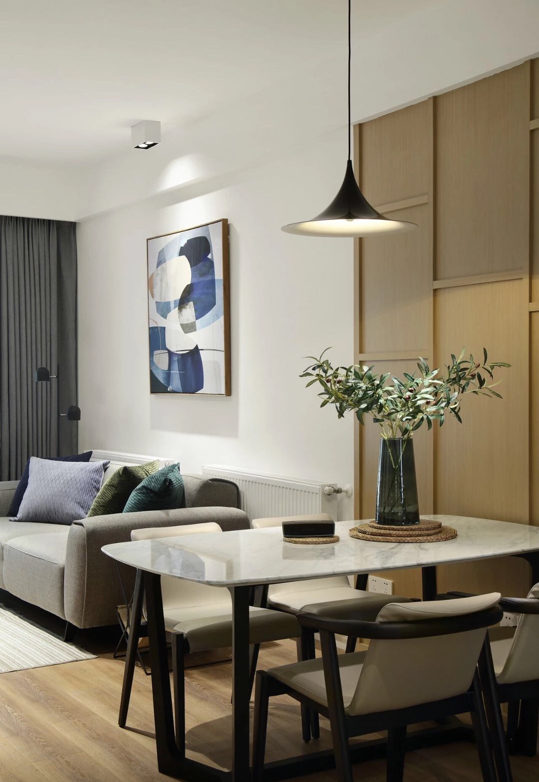 客厅整体设计的十分简洁,未加过多修饰的白墙,从视觉上延伸空间,增强通透性。蓝色挂画打破单调,丰富了客厅的层次感。