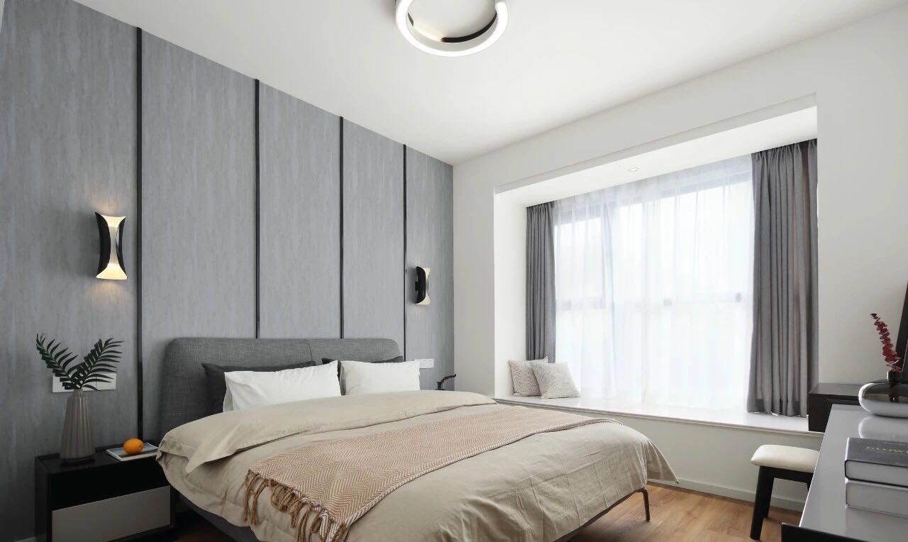 蓝色床头背景墙壁纸,勾勒上流畅的黑色线条,优雅精致,营造静谧的休憩之地。