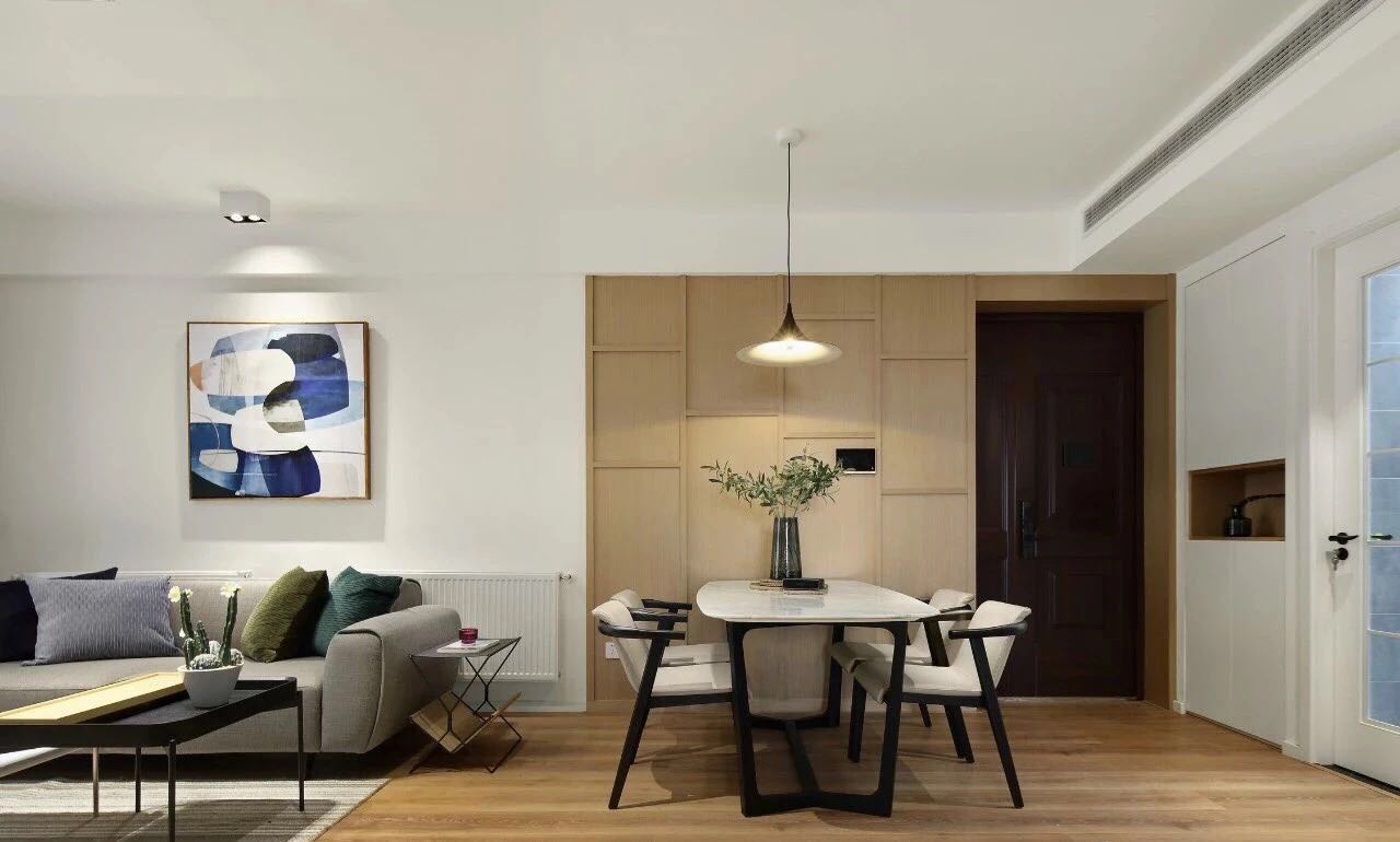 客餐厅相通,空间更显通透明亮。背景墙用原木饰面做装饰,结合原木地板,增强整体统一性。
