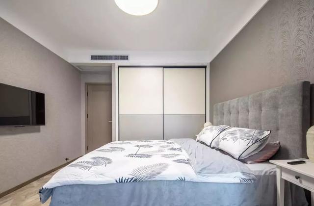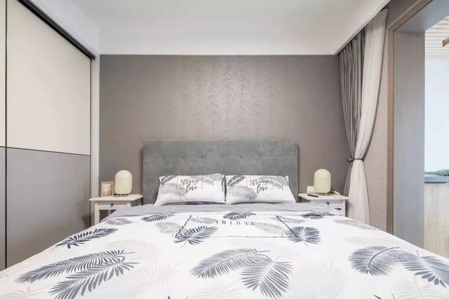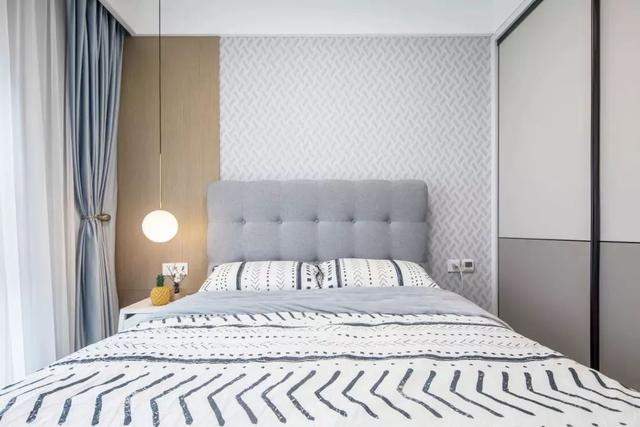主卧背景墙铺了壁纸,颜色稍微能深一些,显得低调沉稳。床头柜体型都很小,方便放置台灯,或者摆设日常用品。在收纳上,有装推拉门式的衣柜。