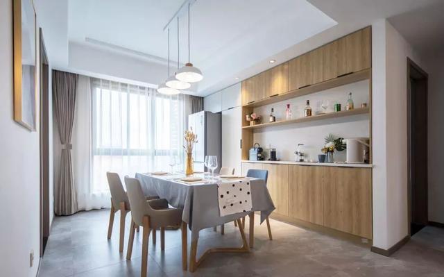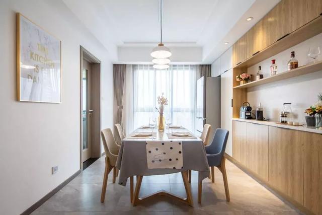 餐厅,最实用的设计,要属这一面嵌入式餐边柜了,原木色,中间是开放式设计,摆些酒品,或者日常用品,都很方便。冰箱是镶嵌在了最里面的吊柜底部。
