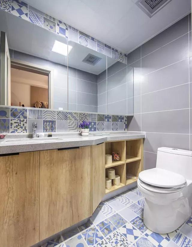 洗漱台,一直延伸到墙壁一边,还有镜子柜也超大,这对于洗漱用品的收纳,足够了。