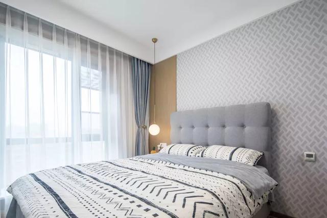 次卧,背景墙的设计很有特点,是以壁纸为主,不过在最里侧铺了一列木饰板,这搭配在一起就很个性了,当然也很漂亮。