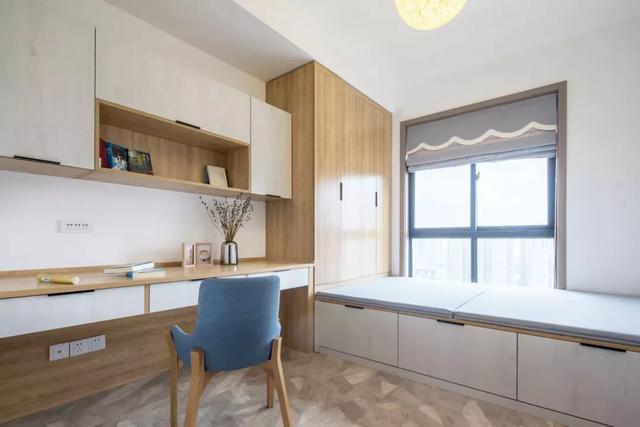 书房装了榻榻米与一体相连的衣柜,这必要时铺上软装,就是一间客卧了,功能比较多,可以合理充分利用。书桌上方还装了书架,日常工作与简单收纳足够了。