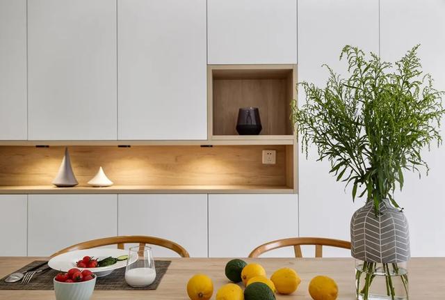 ▲客厅电视墙侧边的柜子,隔着走廊与餐边柜形成了对称的造型设计,洁白的空间,加入自然舒适的木质感,整体显得温润舒适而档次大方。