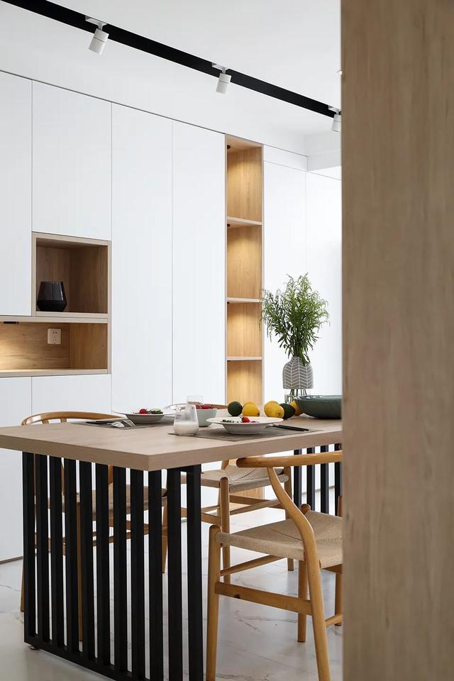▲餐厅空间的收纳功能非常强大,两侧都装了餐边柜,中间布置厚板餐桌,浅木色的餐桌台面与餐椅布置,结合无主灯的天花设计,也是显得温馨而又惬意舒适。
