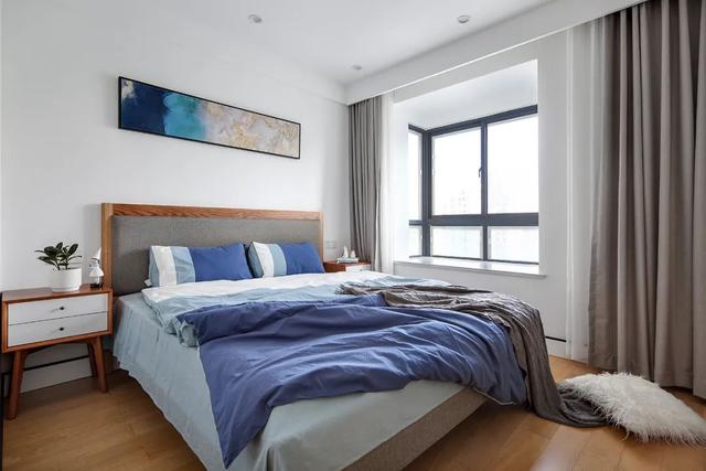 ▲卧室空间整体氛围比较洁净,床头墙挂着一幅横幅的装饰画,搭配木质框架带布艺靠背的床铺,简洁舒适的床单与窗帘布置,营造出一种实用轻松的卧室氛围气质。