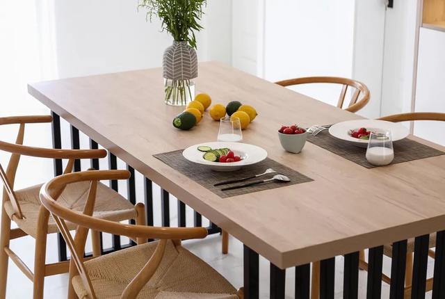 ▲木质的餐桌台面,摆上餐具花瓶与水果布置,也让用餐空间显得更加精致情趣。