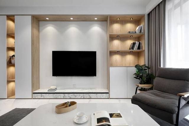 ▲电视墙两侧是定制的收纳展示柜,两边的开放书架格架上布置书籍与绿植小饰品,使得空间自然而清新;结合中间大理石质感的地台电视柜,壁挂电视机上方的木质天花,加入筒灯的装饰,也让空间显得简约自然而大气。