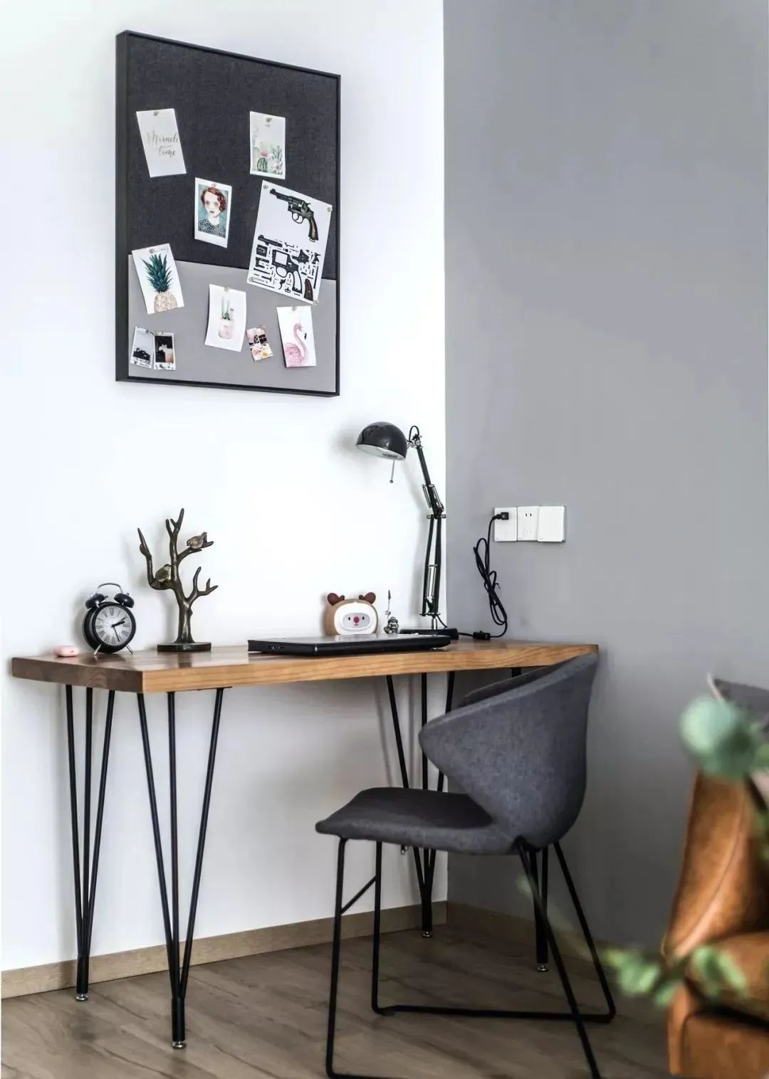 在沙发旁摆放一张成品小书桌,细腿的书桌椅更显空间轻盈,偶尔在家工作也完全可以。