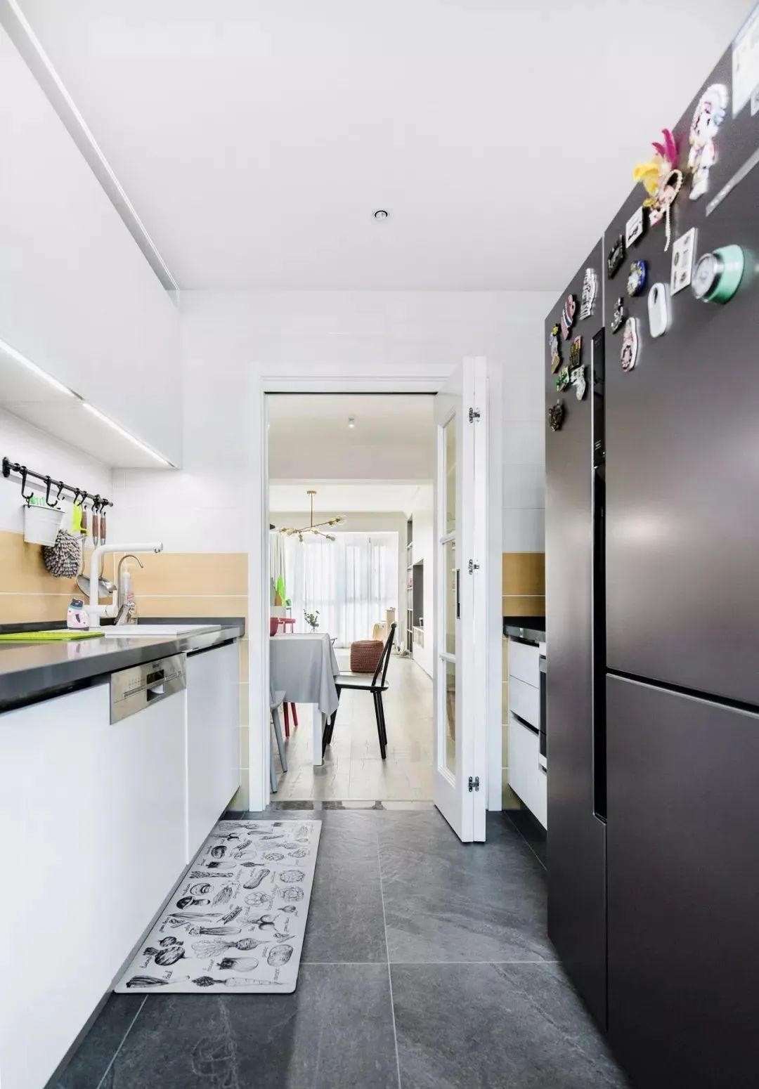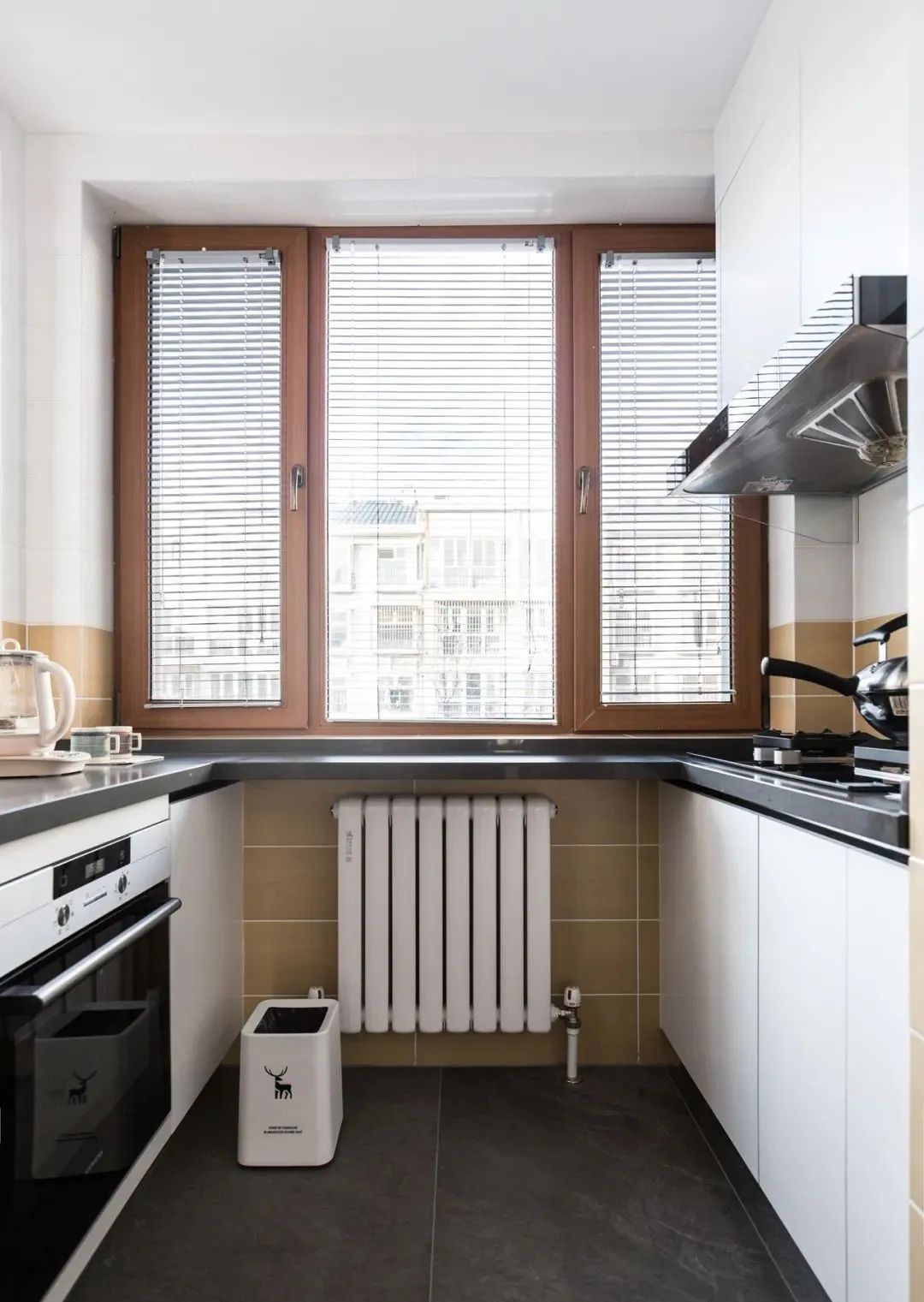 U型厨房的布局,地面灰色地砖耐脏还耐看,厨电都嵌入橱柜里,不多占用空间。