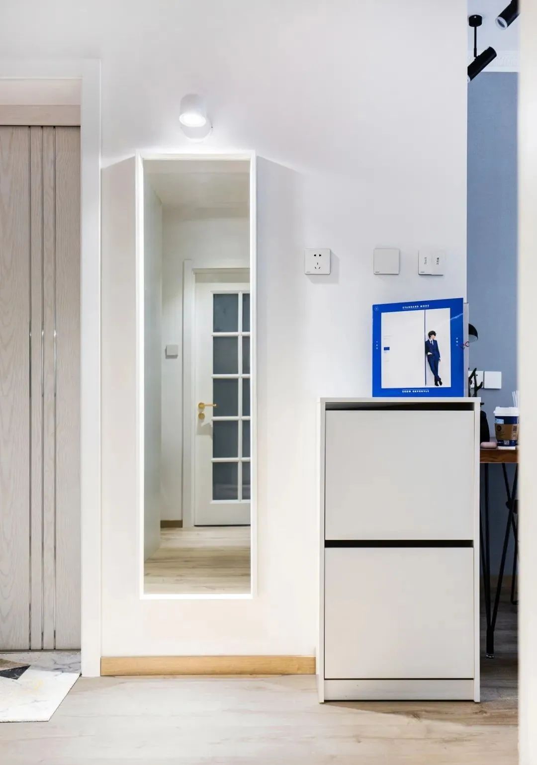 进门玄关一侧墙面挂了全身镜,上方还特意安装壁灯照明,镜子旁的矮柜也增加了收纳,矮柜台面也能随手放置包包、钥匙等小物件。