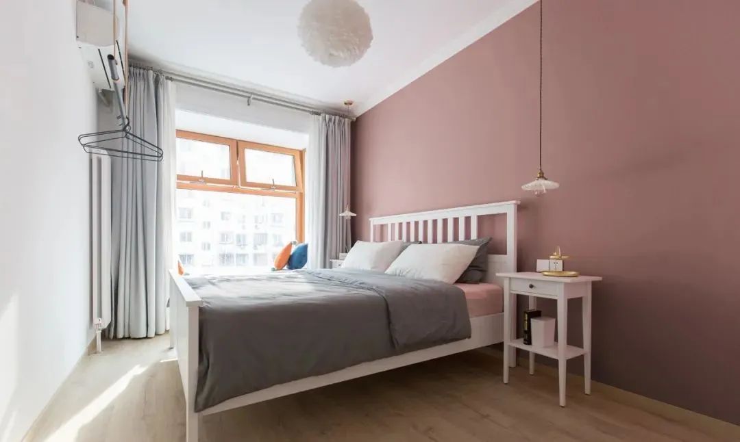 主卧,烟粉色的床头背景墙高级又温柔,搭配简约唯美的吊灯,整个卧室简约却很温馨。