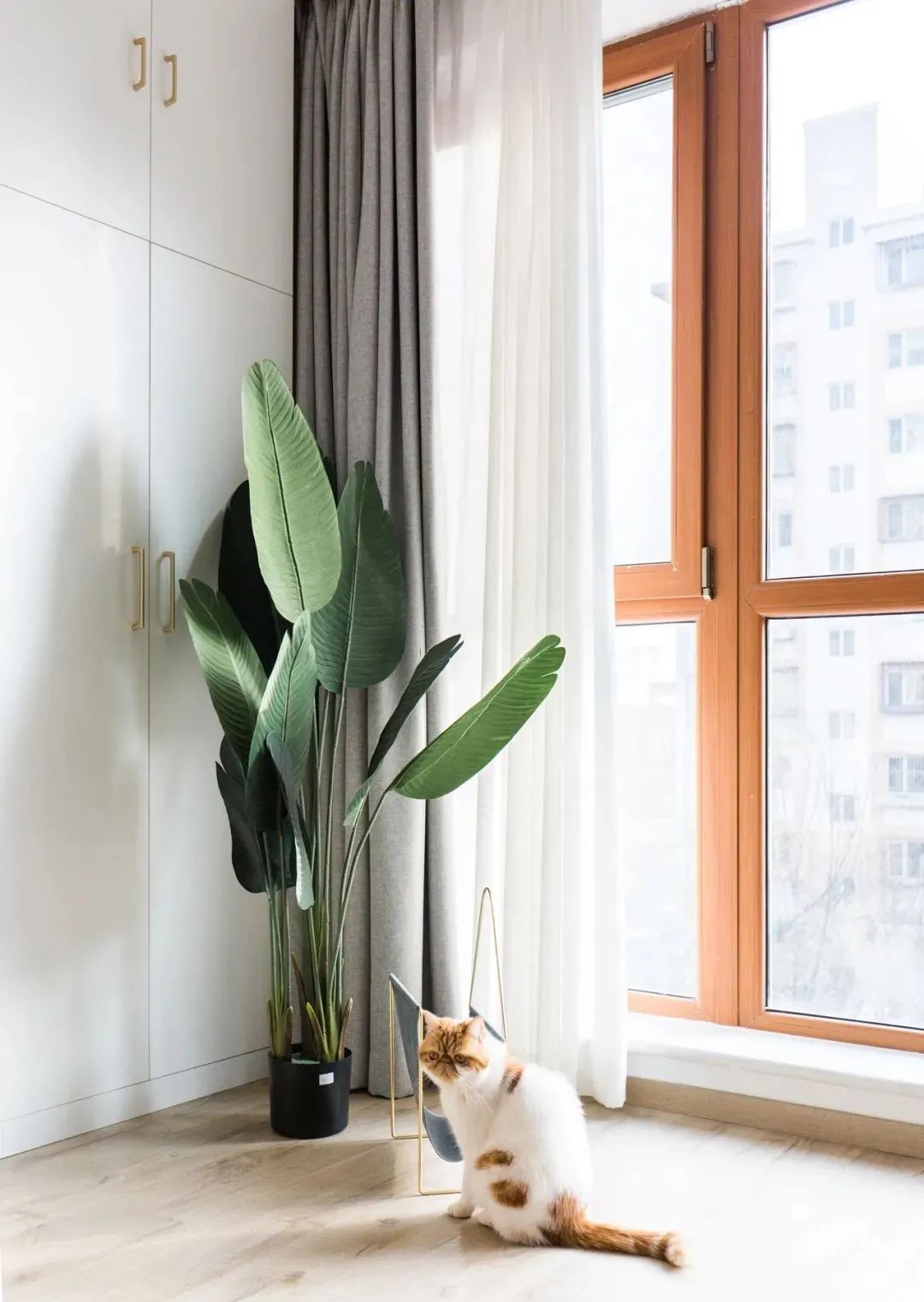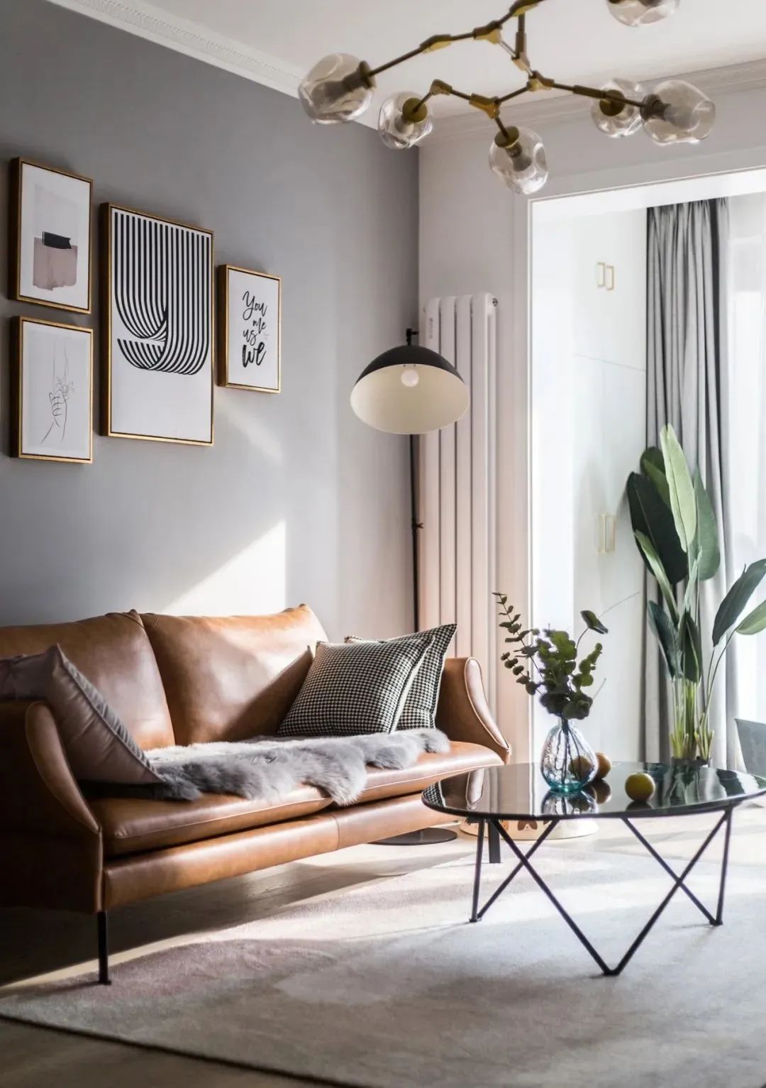 简约大方的茶几,摆放上绿植更显自然,客厅里金属质感的吊灯时尚轻奢,细节处加分不少。